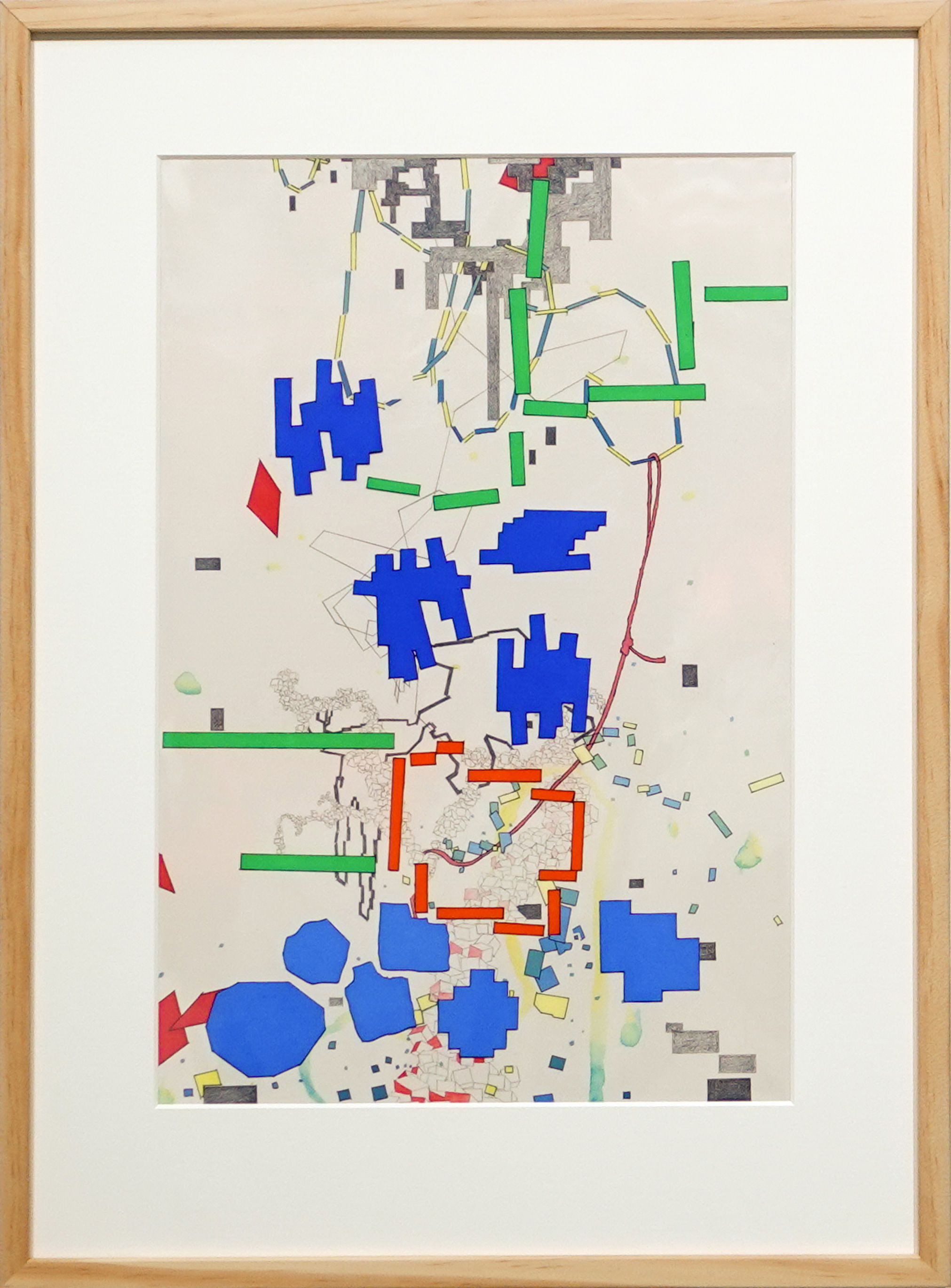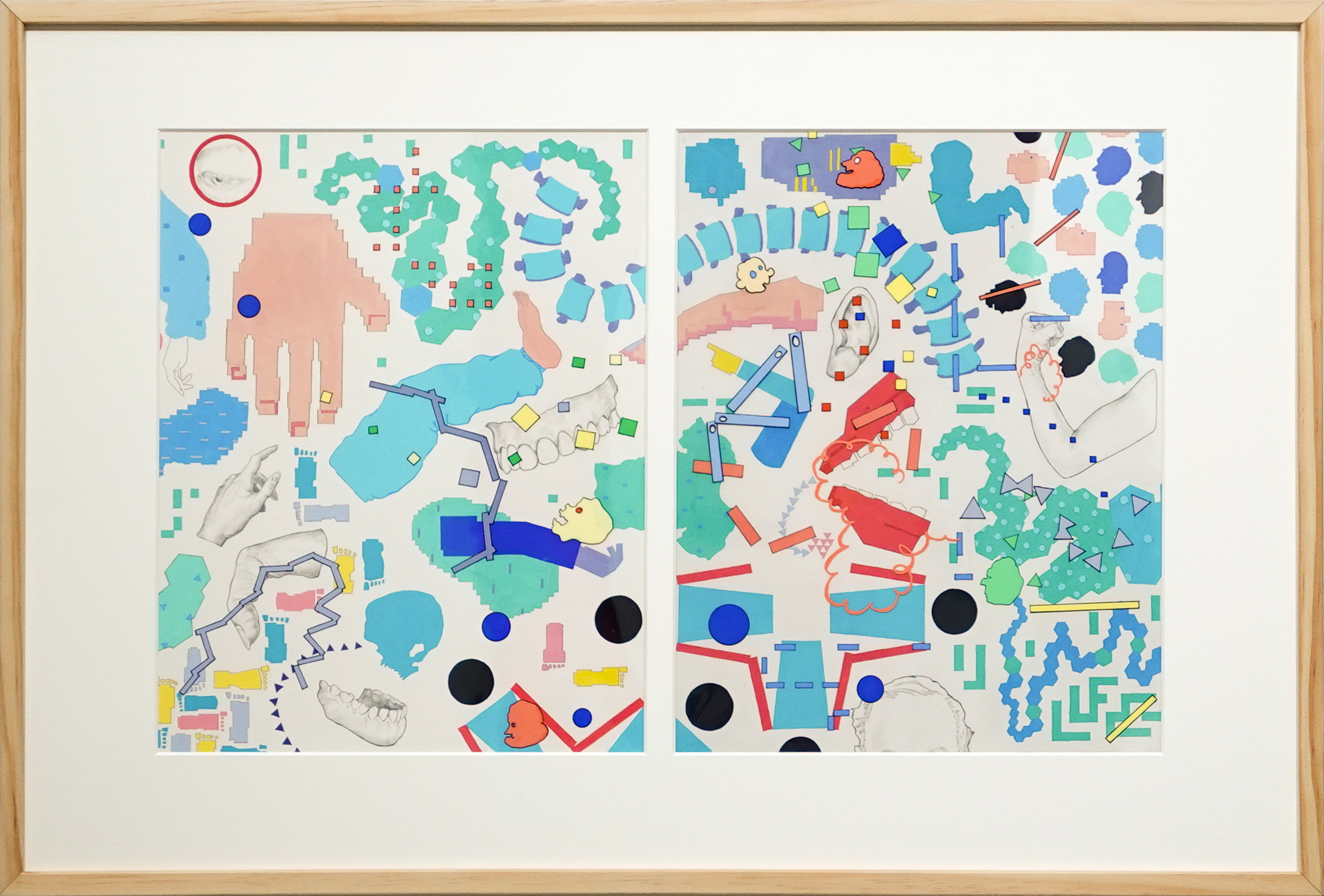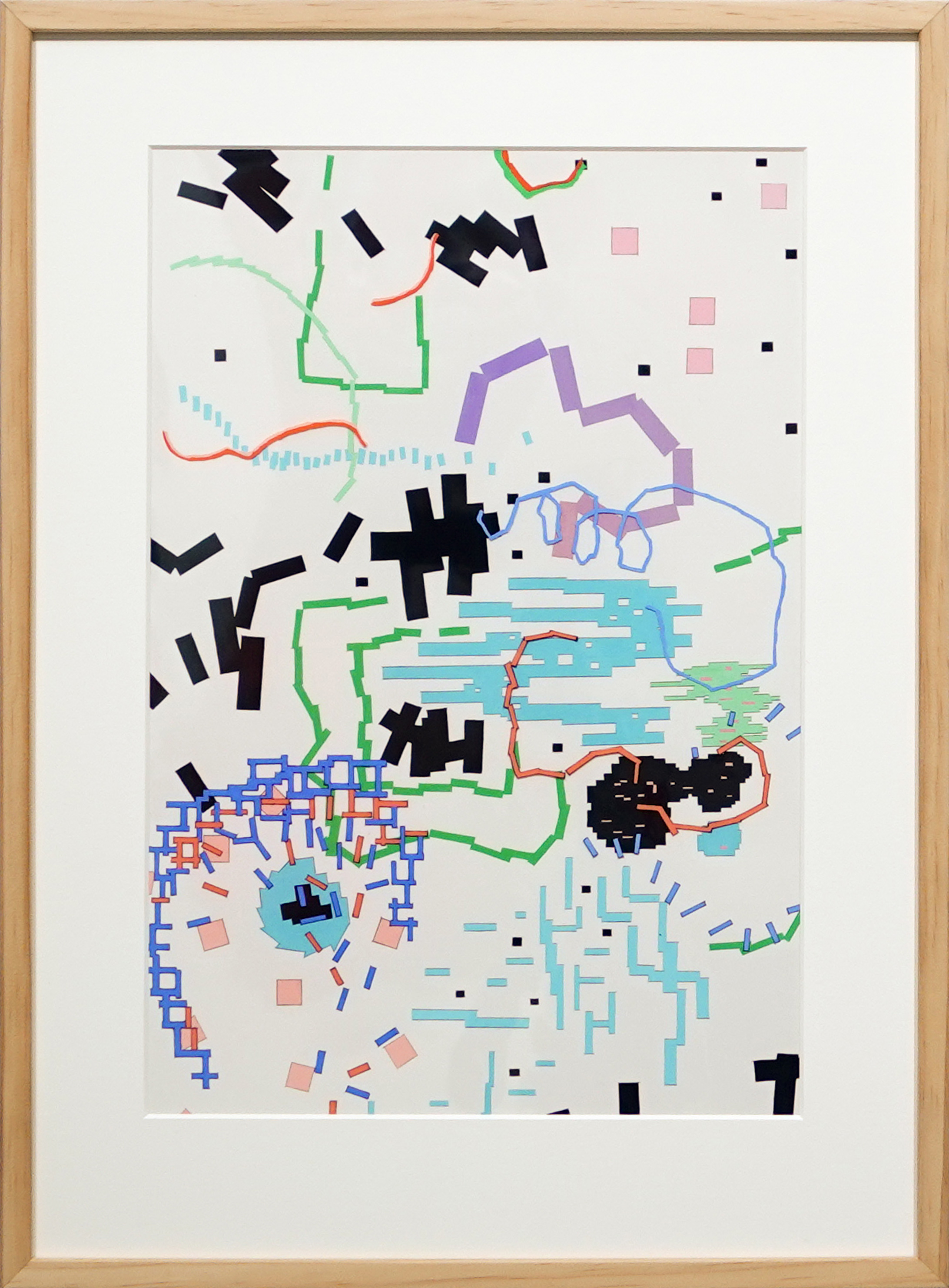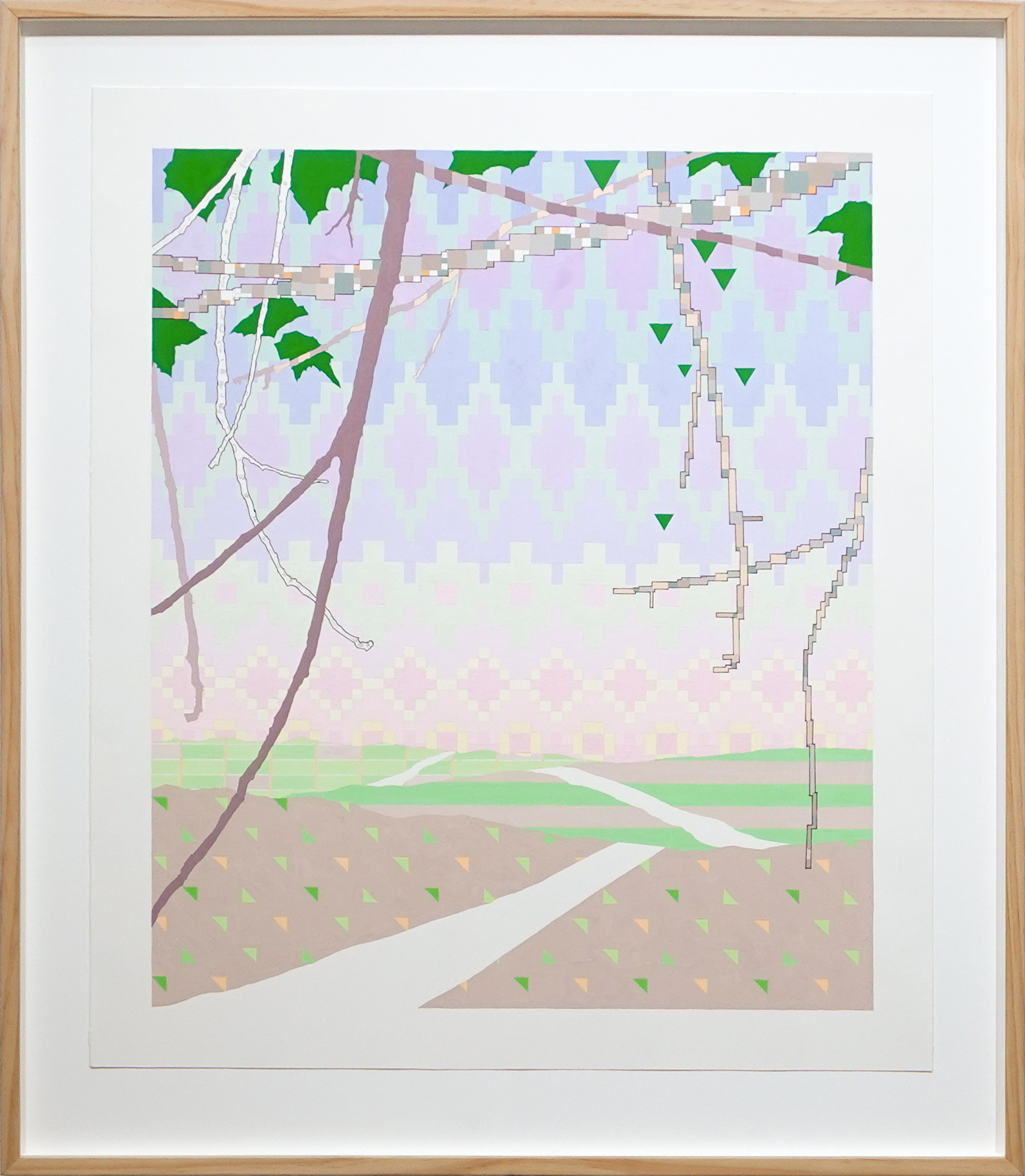 This body of work on paper and acetate, Drawings, dense and slim, plays with ideas of nature and artificiality, presenting a wide array of imagined spaces, from highly fanciful recreations of the inner workings of a machine, to a landscape that scrolls out in a loop. They are intricately constructed and detailed with contrasting patterns, colours and spatial arrangements. I think much of my work could be described as containing a faux-digital aesthetic; some of the patterning I use is reminiscent of pixels. I say ‘faux’ because it’s all handmade.