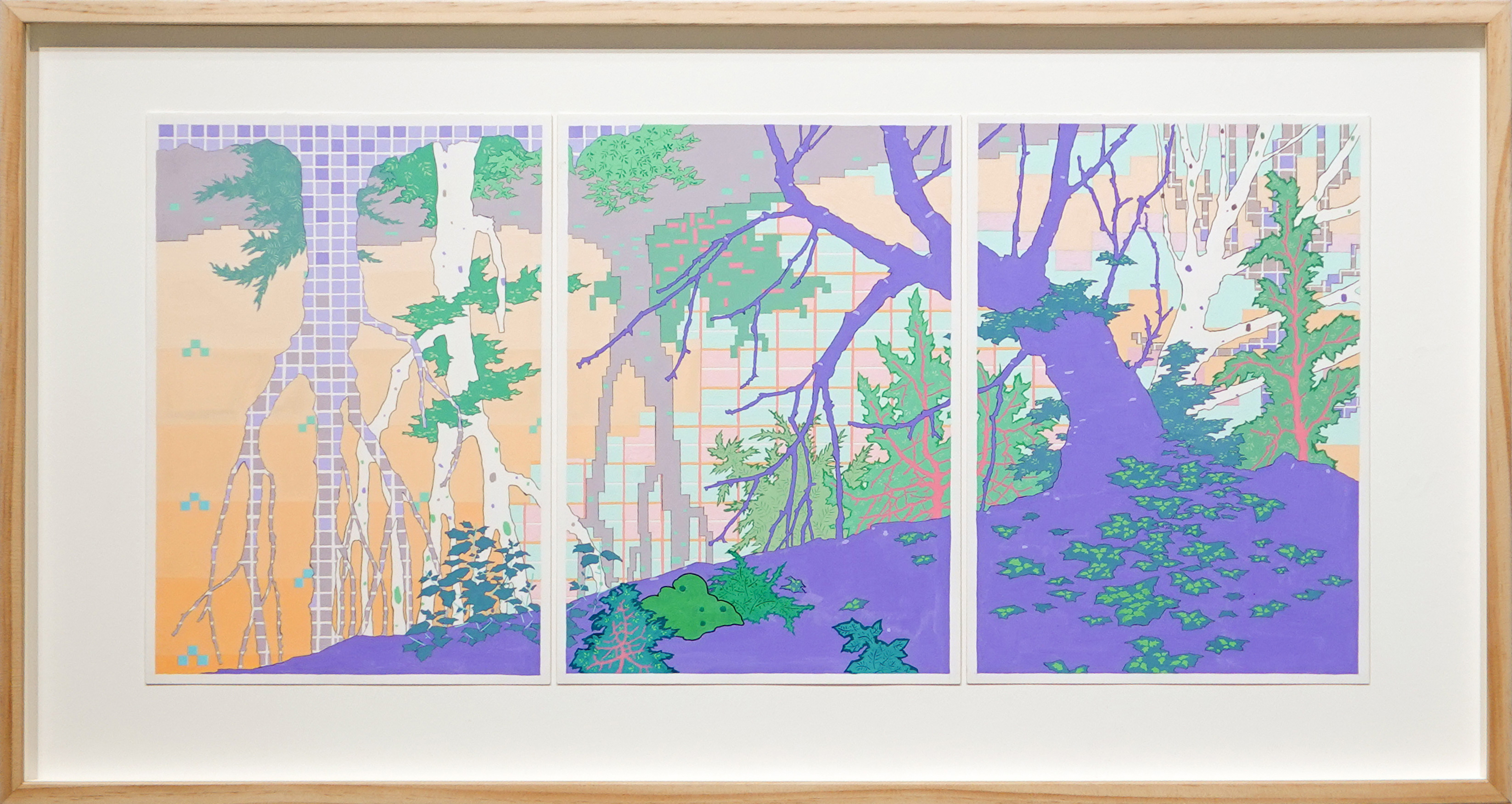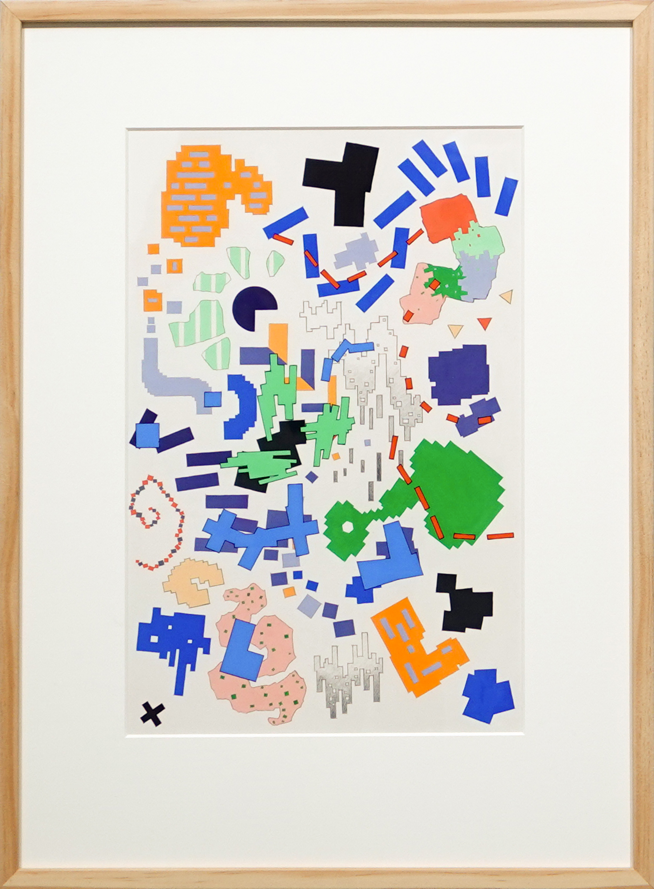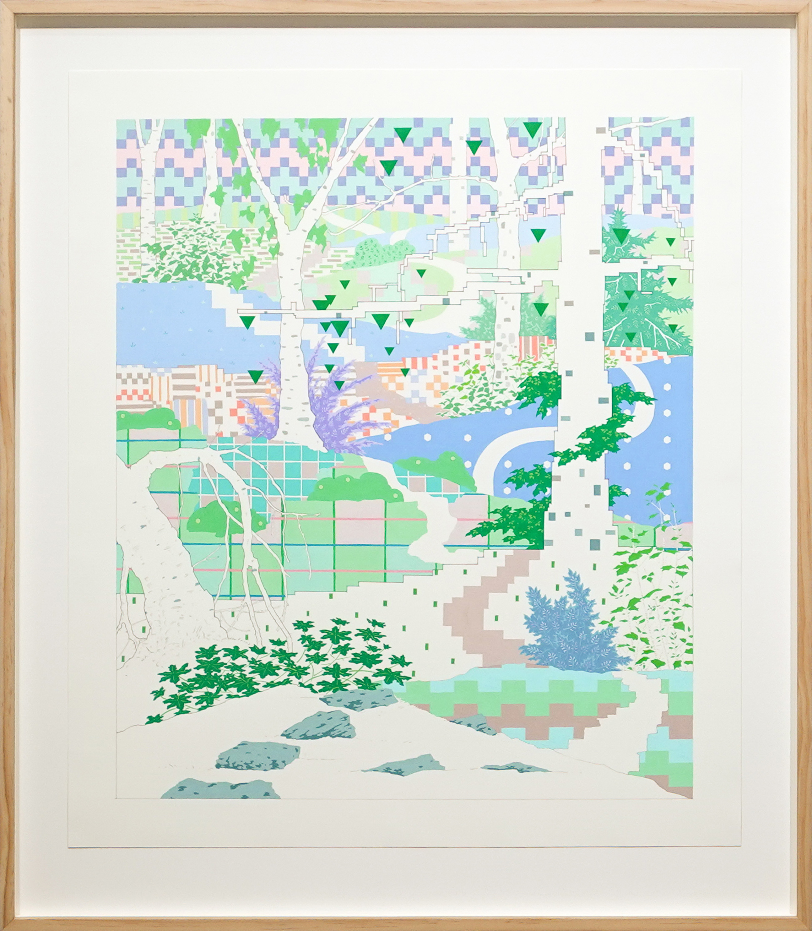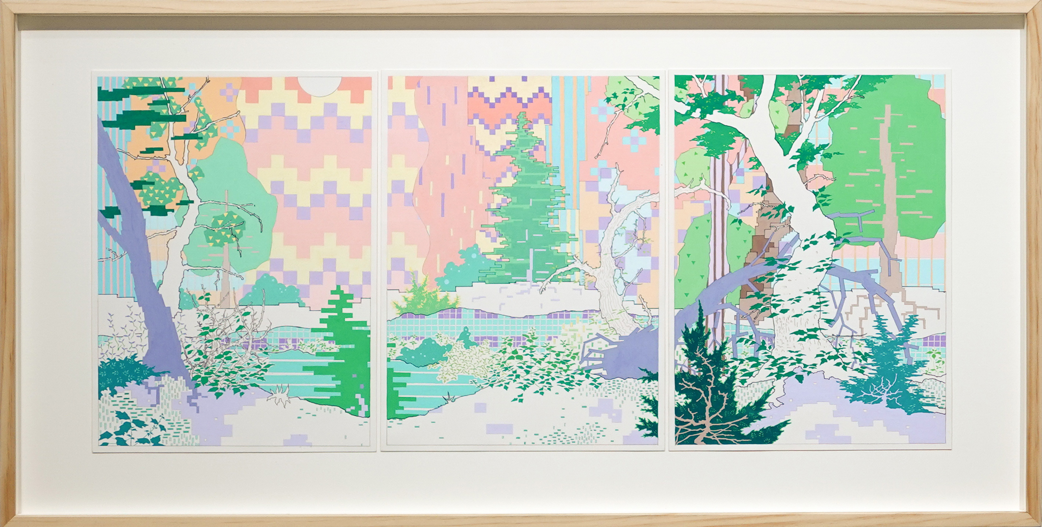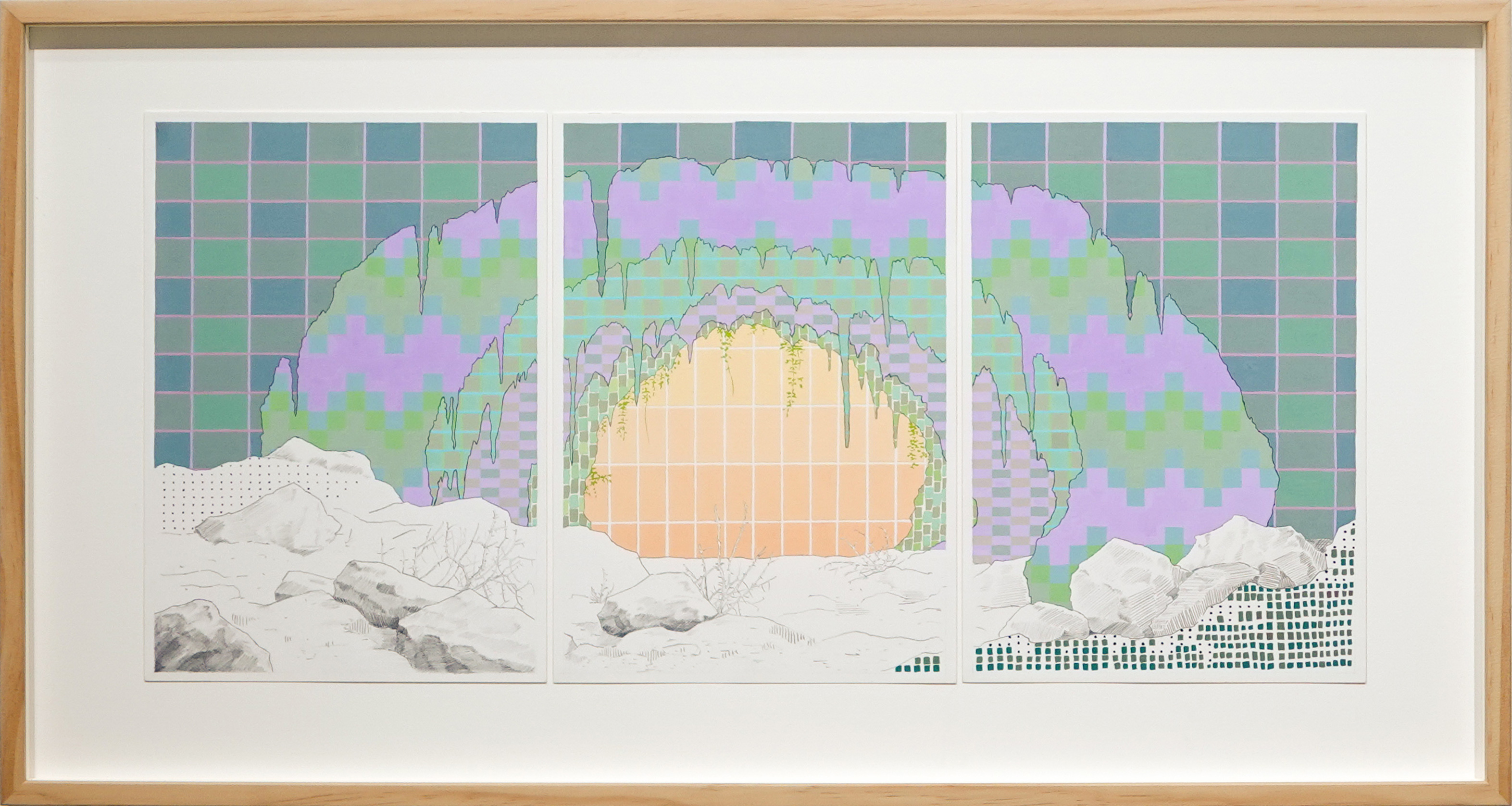 This body of work on paper and acetate, Drawings, dense and slim, plays with ideas of nature and artificiality, presenting a wide array of imagined spaces, from highly fanciful recreations of the inner workings of a machine, to a landscape that scrolls out in a loop. They are intricately constructed and detailed with contrasting patterns, colours and spatial arrangements. I think much of my work could be described as containing a faux-digital aesthetic; some of the patterning I use is reminiscent of pixels. I say ‘faux’ because it’s all handmade.