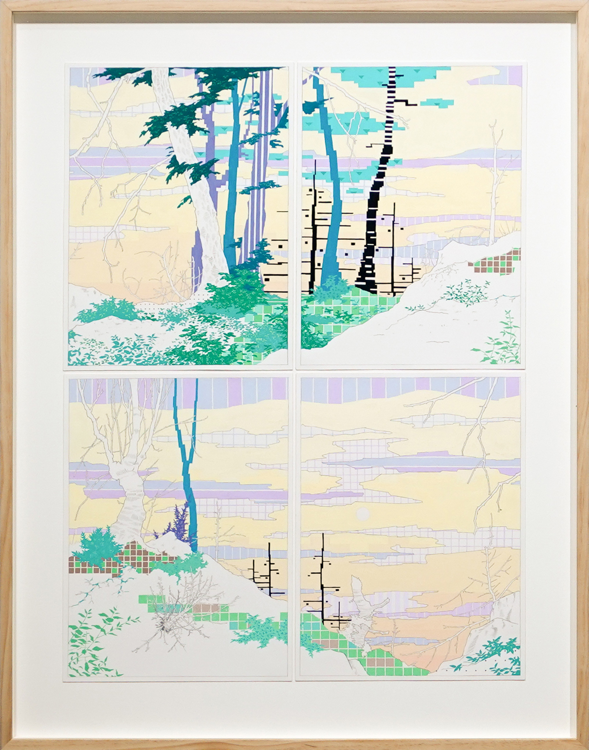 My work moves between abstraction and realism, drawing in elements of the natural world as well as the influence of basic computer graphics and cel animation.