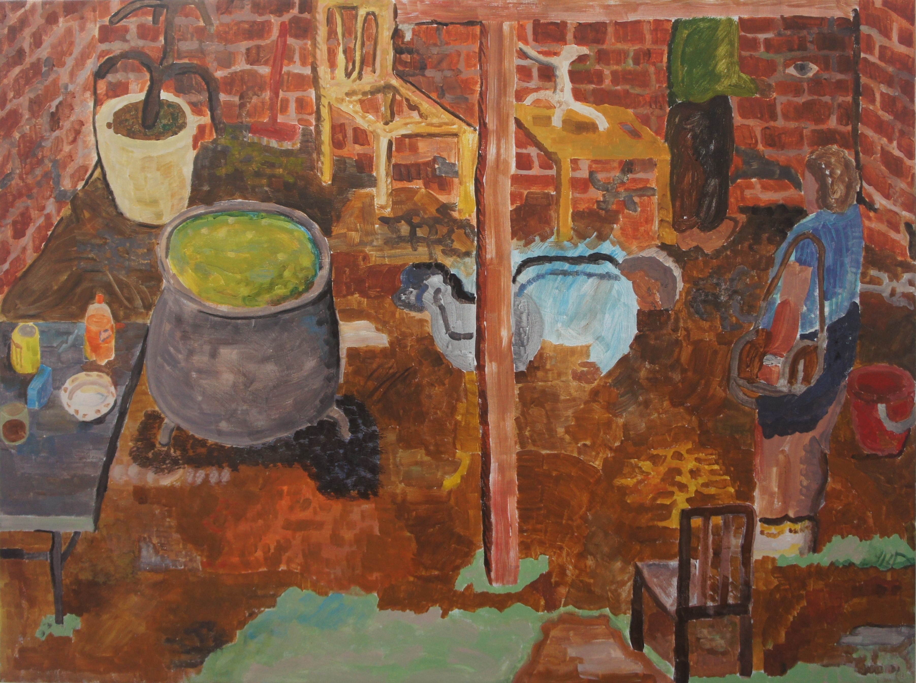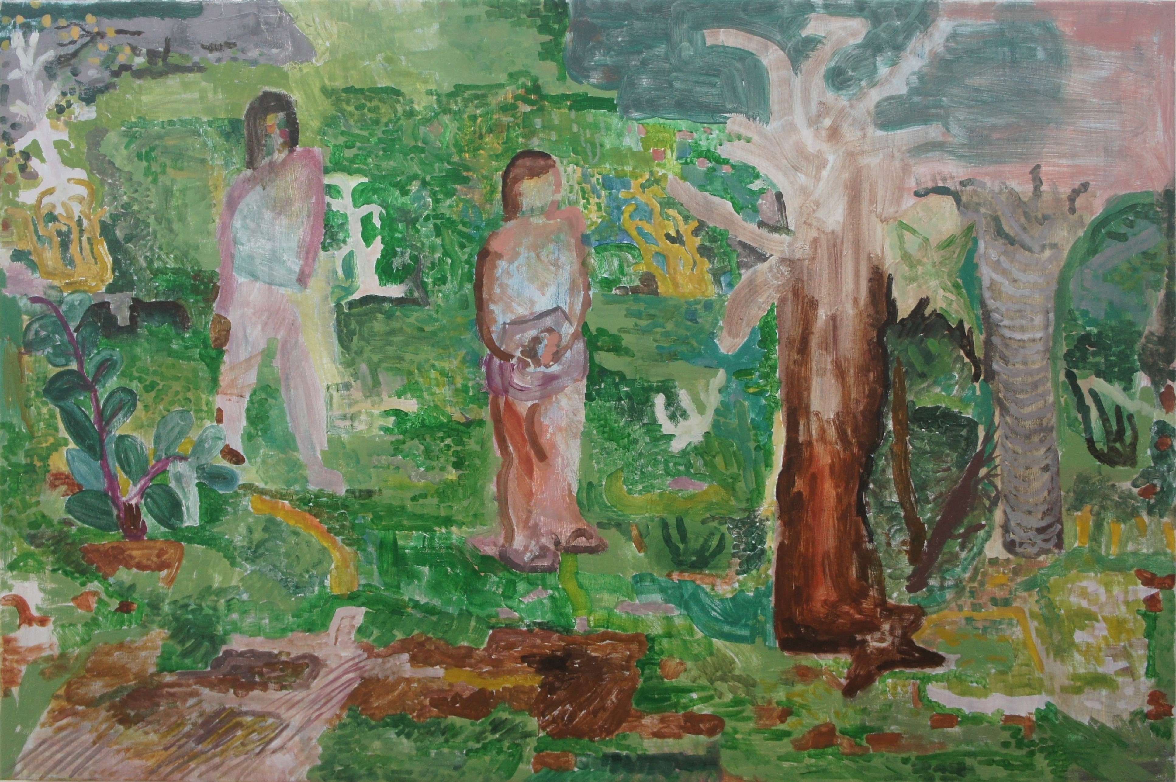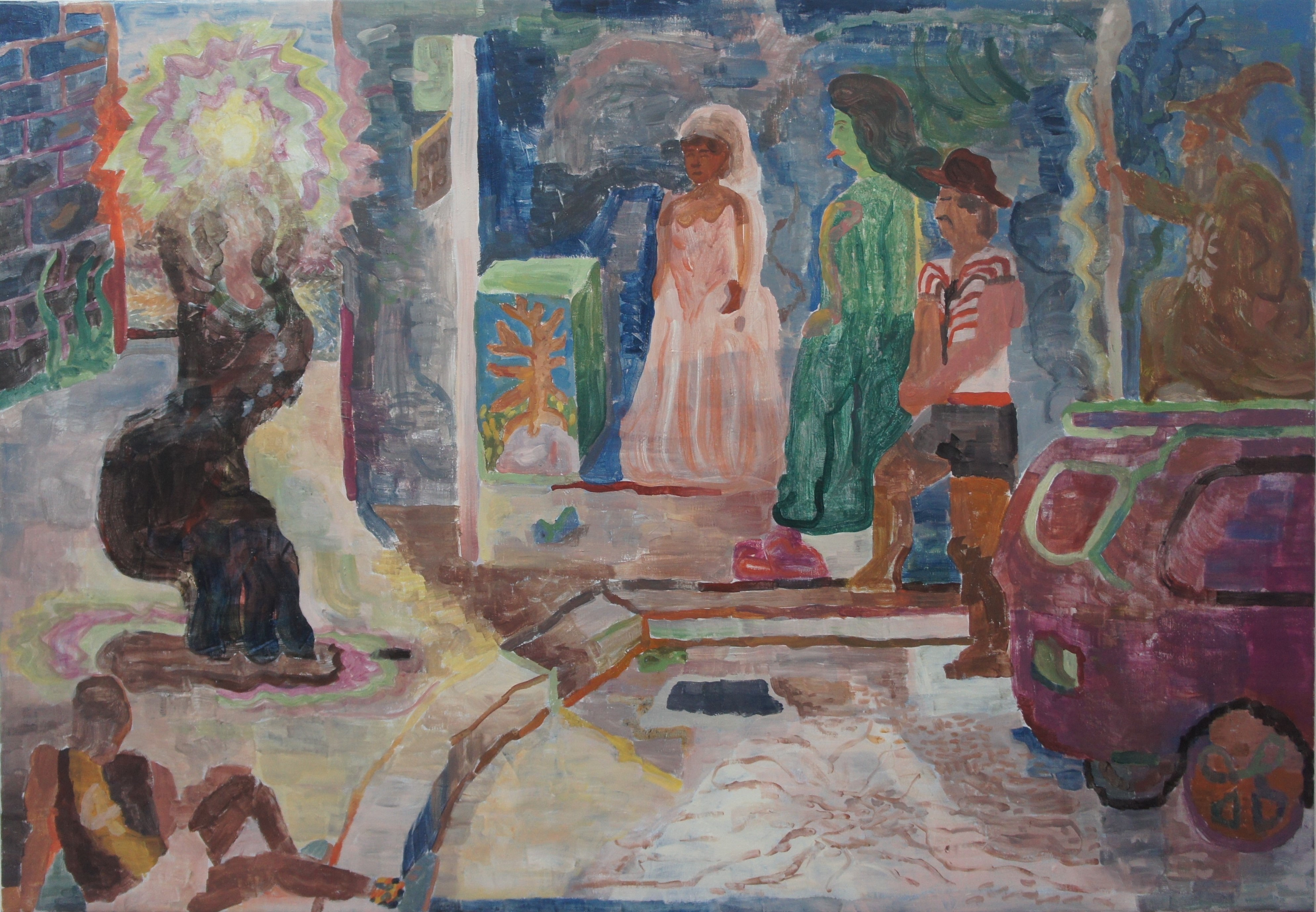 There is a discrepancy between how the real world looks to our eyeballs, how we think and feel about it, and how we recreate it by painting. Paintings are staged, but I want the staging to indulge in real life as much as possible. The act of painting is a stumbling, haphazard and humble reality, cobbled together through trial and error, accident and instinct. What I see, think, and paint are in constant interaction. My body carries imagery between the world and my canvases. The bodily and thoughtful side of painting can be seen in the marks of paint on the surface. The studio is just another room in the world. I grapple with the flat weave of the canvas and try to bring it to life with spatial ambiguity, colour, texture, and pictures of people thinking they’re up to something when probably they have no idea what they’re up to at all.