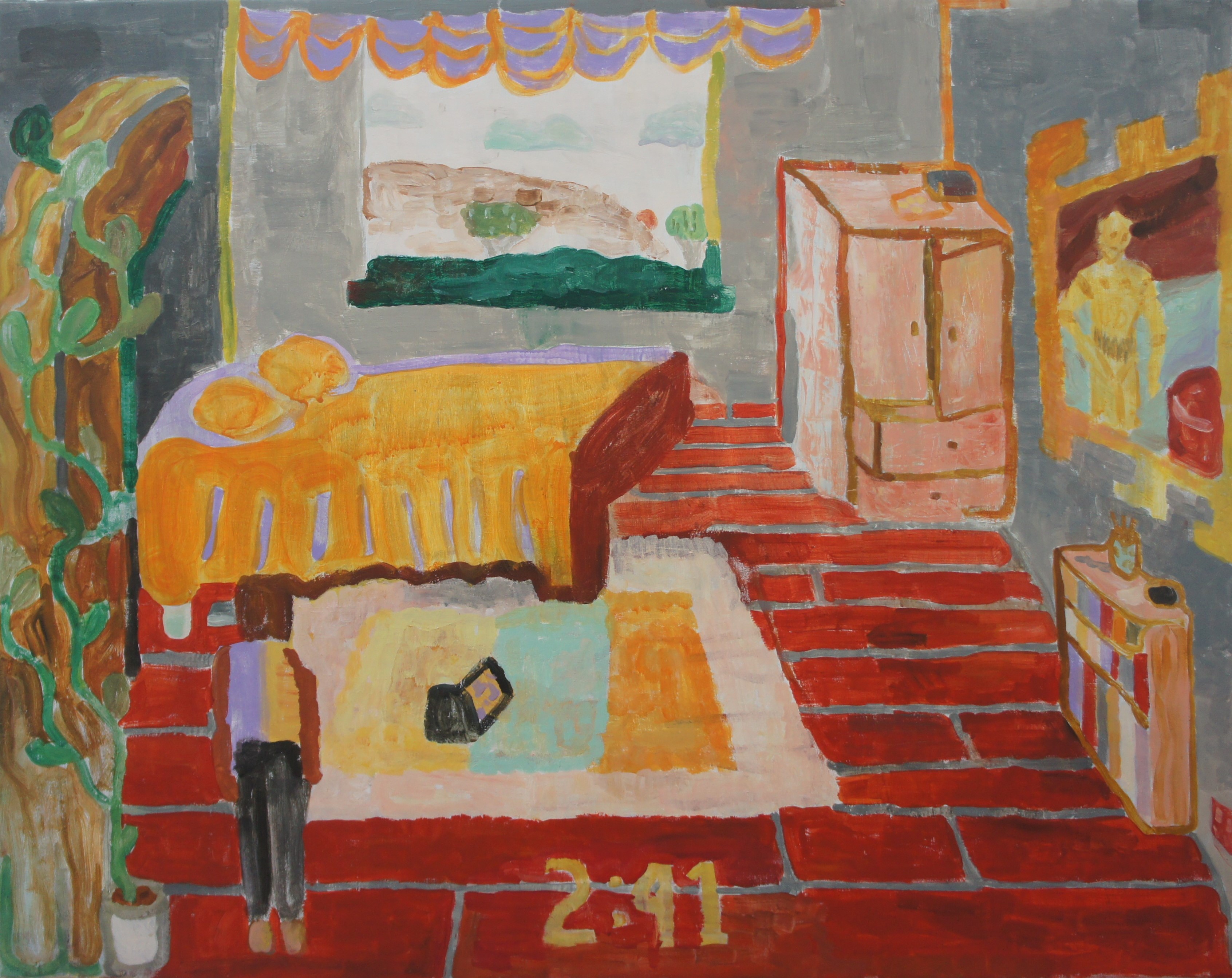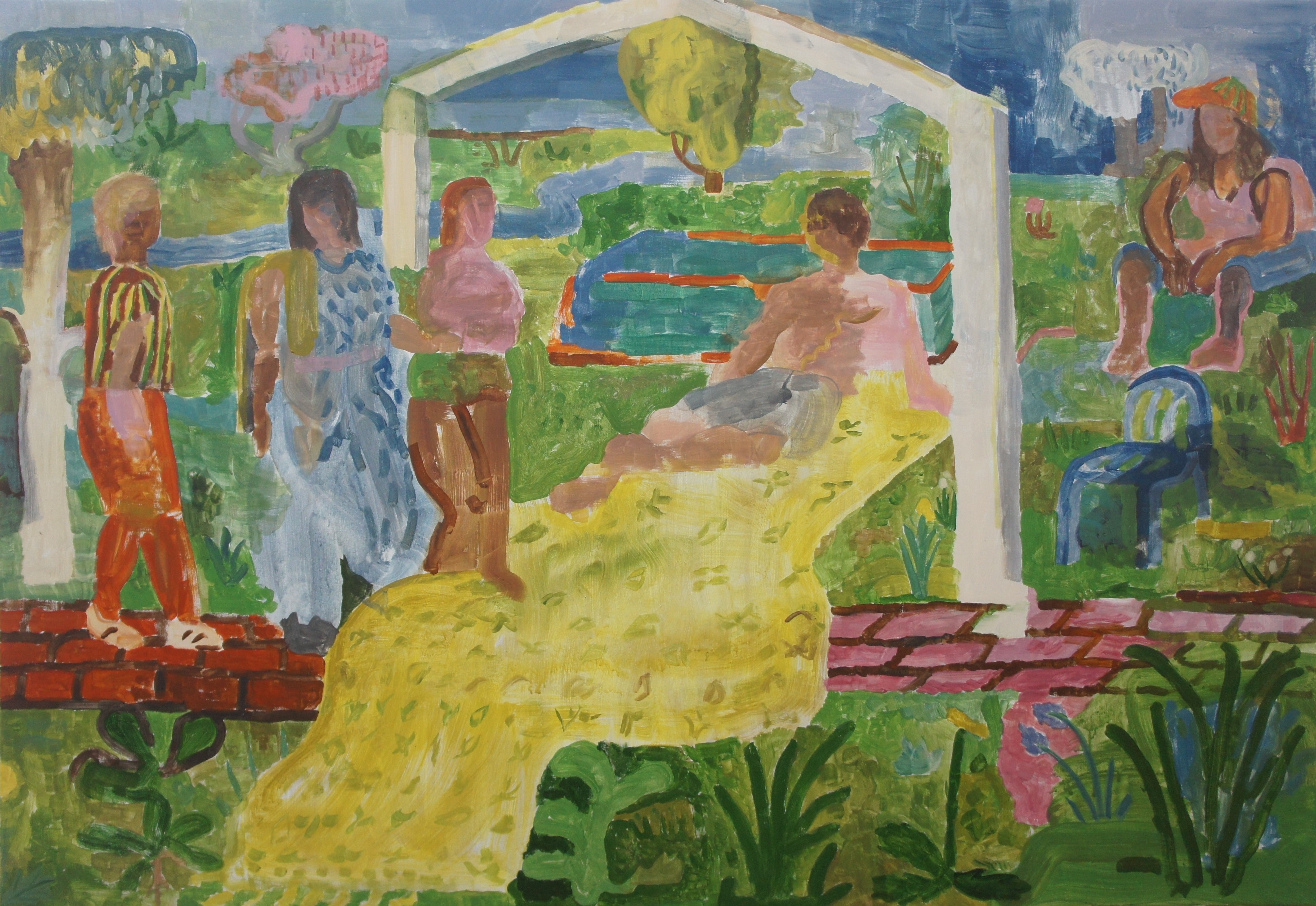 I don’t know what’s inside me. I bounce off what’s outside me, working with what I see in my daily life. I didn’t know I was going to paint a half-naked man reclined on a yellow patterned cloth. The imagery and the story unfurls like the half understood moments that make up our days. Painting is order and improvisation. Within the basic structure, I stare at my painting and think ‘what does it need there?’ I give enough that a story emerges, but for the viewer it must be a choose your own adventure. Narrative writhes beneath their gaze. For the viewer not to know, I can’t know either, because painting is the illusion of meaning.